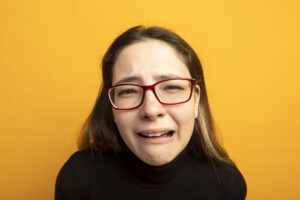unhappy young beautiful girl in a black turtleneck lookign at camera with sad expression standing over orange background