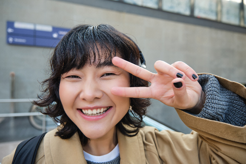 Positive korean girl in headphones, drinks coffee to go, shows peace, v-sign, stands on street and smiles happily