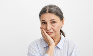 Frustrated female pensioner in blue shirt holding hand on her face having worried uneasy facial expression, thinking about her future. Unhappy sad senior woman suffering from terrible toothache