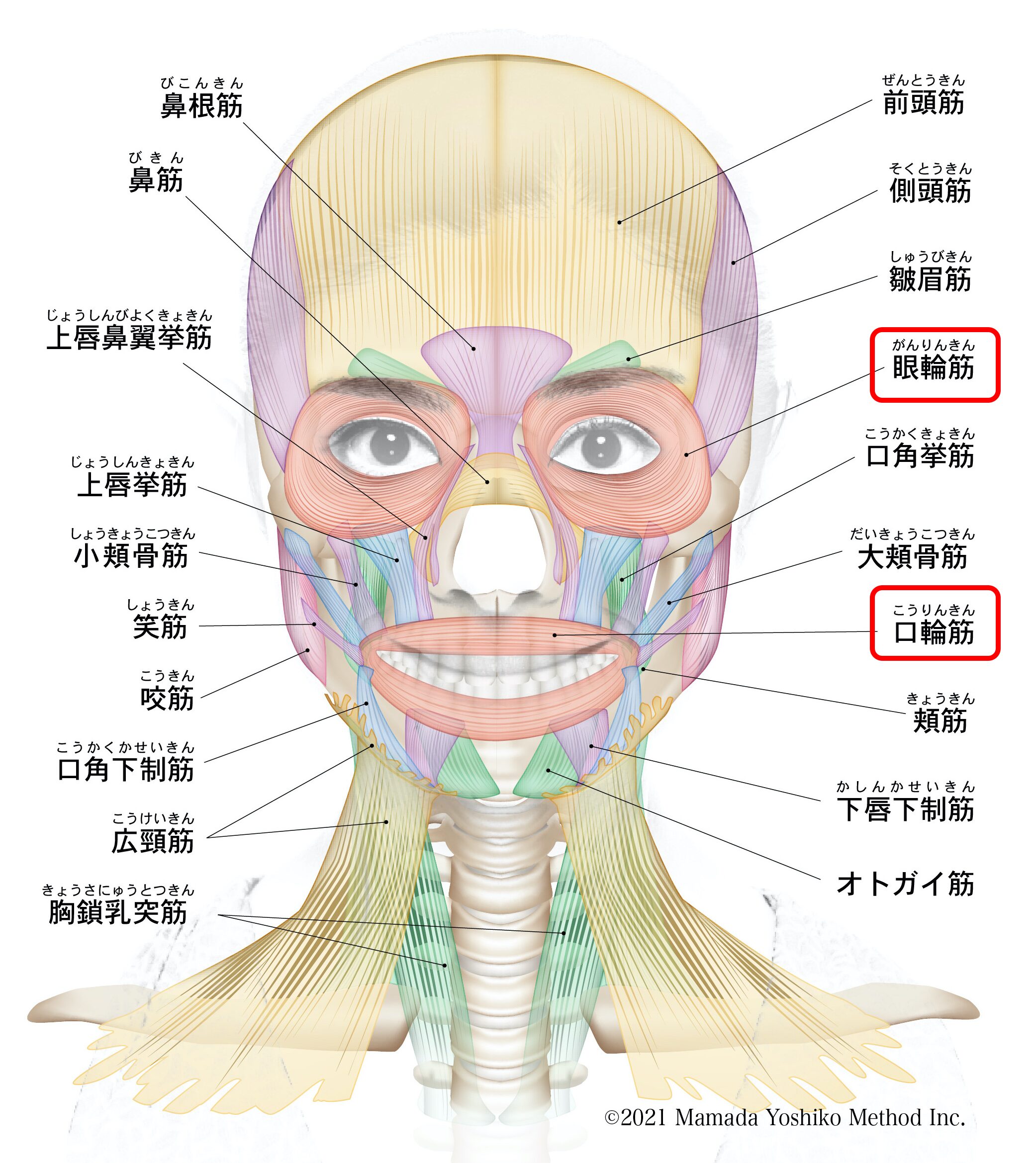 「フェイスシェイク」は、顔にある3つのドーナツ状の筋肉——左右の眼輪筋と口輪筋——をしっかり「閉じる」と「開く」を繰り返して動かすことで、血流を促し、肌のターンオーバーを助けるトレーニングです。