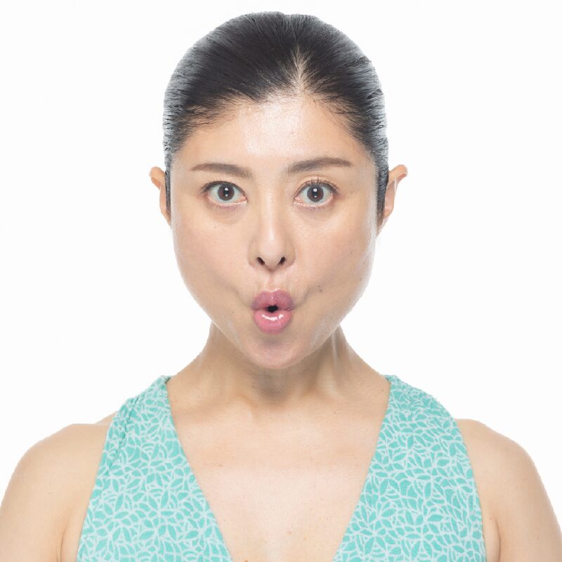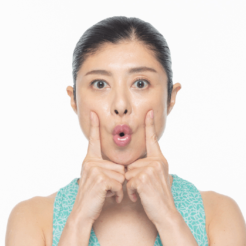 人差し指を頬に当てて後ろに引き、少し頬を外に開きます。唇をすぼめて前に突き出し、5秒キープします。
