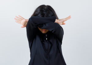 little girl in black coat holding arms crossed and looking frus
