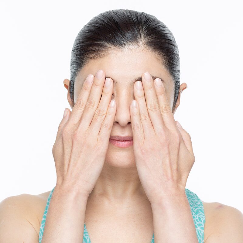 まずは手のひらで目の周囲をやさしく覆います。手の温かさで血行が促され、これだけでもじんわりと目が緩んでいきます。